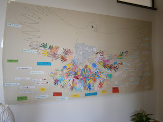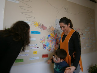 Colaboramos com as turmas de referência e colamos no painel coletivo da escola as mãos que fizemos e enfeitamos na sala da UAM.