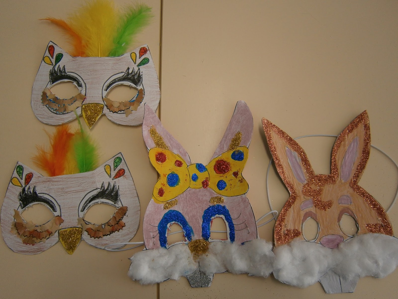 As máscaras com a temática de cada turma. 1º ano- Corujas; 2º ano - Coelhos